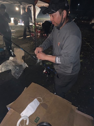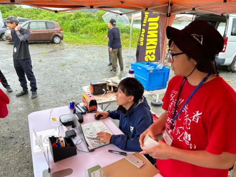 安心しつつタープ等設営を始めるも協賛品の段ボールはグショグショに。。。