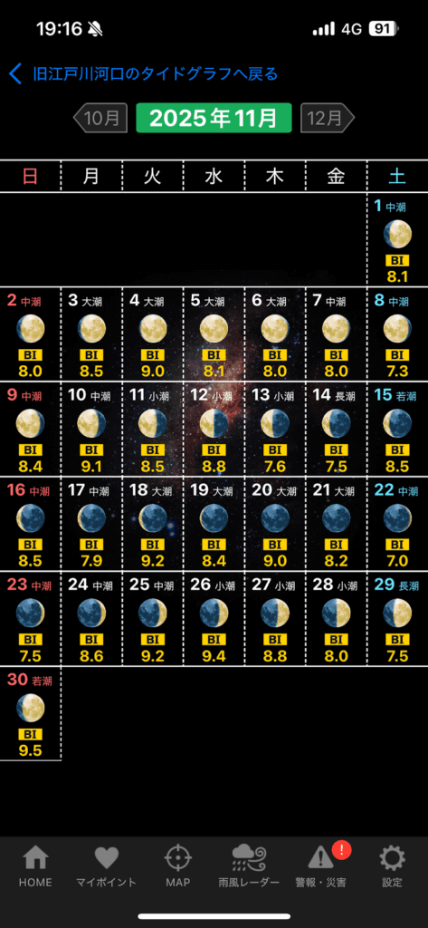 さらに、大潮が一番潮位変動が大きいと思われがちですが、実は中潮→大潮→中潮の流れの中で、大潮後の中潮(後中)がもっとも潮位変動が大きいです。これは覚えておくと有利です。
